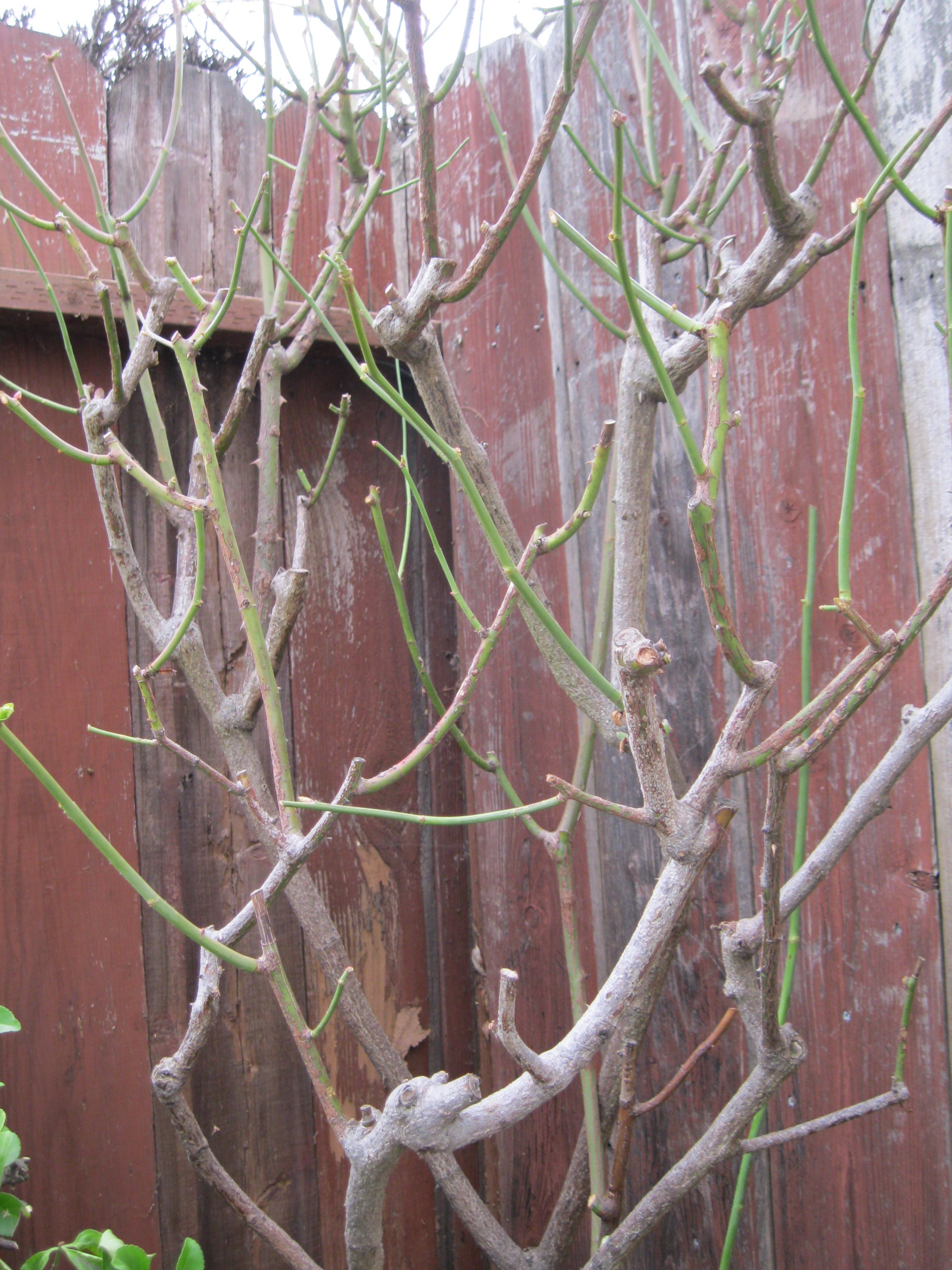 This morning I was at it again. When I went to get my tree yesterday I took a class in rose care and pruning. The cold January day gave me the perfect opportunity to practice on the Sterling Silver rose in the front yard, a tangled mess that had not been properly pruned in years. Our instructor said that roses were forgiving so I took courage and pruned wayward branches, cut away rose hips, clipped yellow leaves. When I could get to the bottom of the plant I took off suckers, cleared away debris, removed the intruding branches of the nearby hedge. I hope the rose will appreciate some air and light.